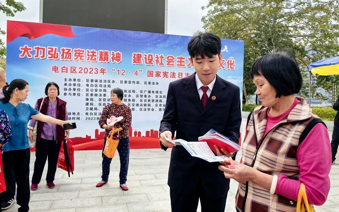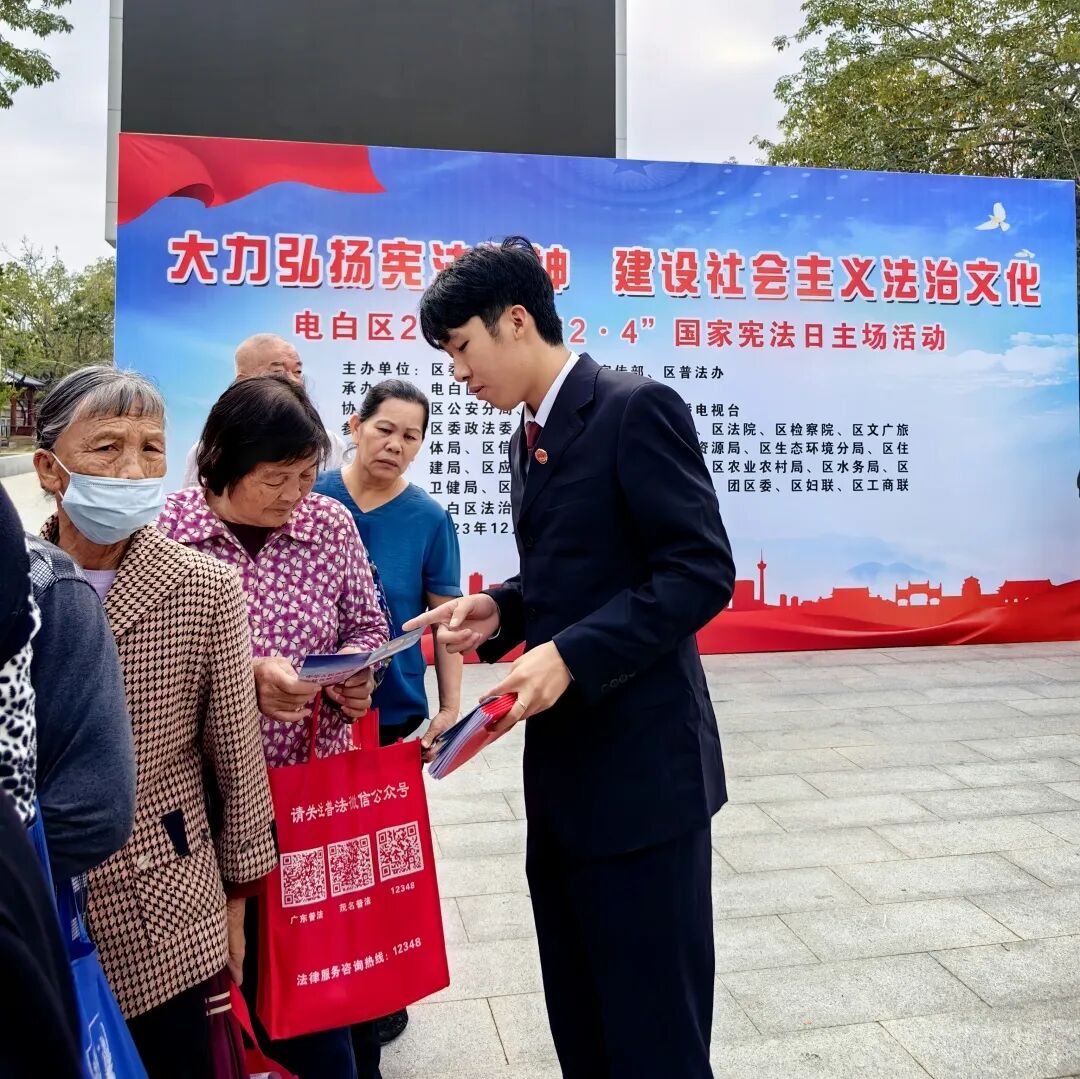 12月4日,电白区检察院组织干警到电白区法治文化主题公园开展普法宣传活动。活动现场,检察干警通过设置咨询台、悬挂宣传横幅、发放《中华人民共和国宪法》手册等形式,为现场群众普及宪法知识,耐心解答生活中遇到的法律问题,引导群众办事依法、遇事找法、解决问题用法、化解矛盾靠法,助力宪法精神融入群众生活,走进百姓心中。