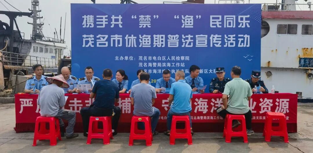 为加强海洋渔业生态环境保护,进一步防范非法捕捞水产品违法行为,电白区人民检察院于休渔期前夕联合茂名海警局滨海工作站、茂名市海洋综合执法支队滨海新区大队到博贺开展“携手共‘禁’ ‘渔’民同乐”休渔期普法宣传活动。