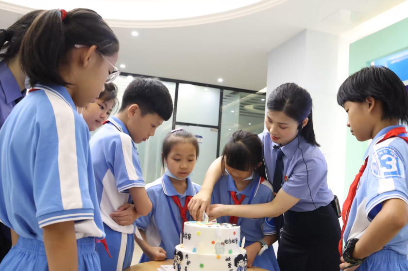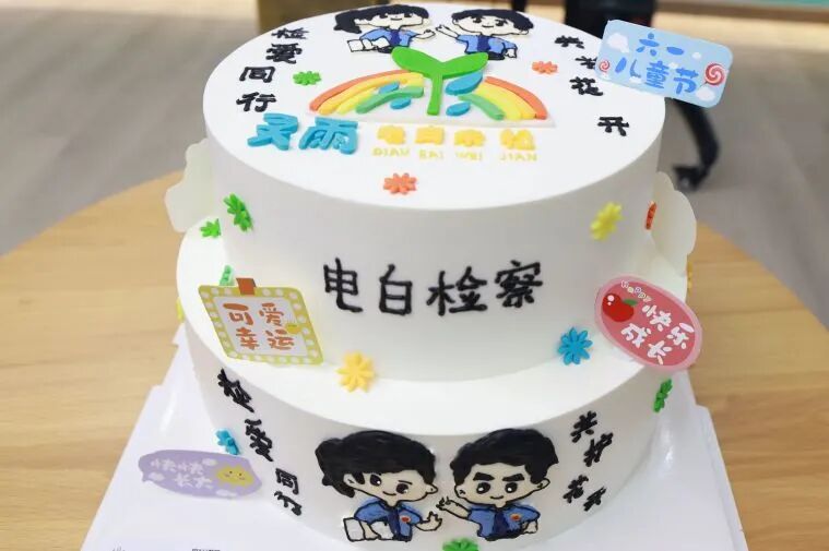 游戏结束后,检察干警和孩子们一起切“灵雨”LOGO蛋糕,提前为孩子们庆祝“六一”儿童节。