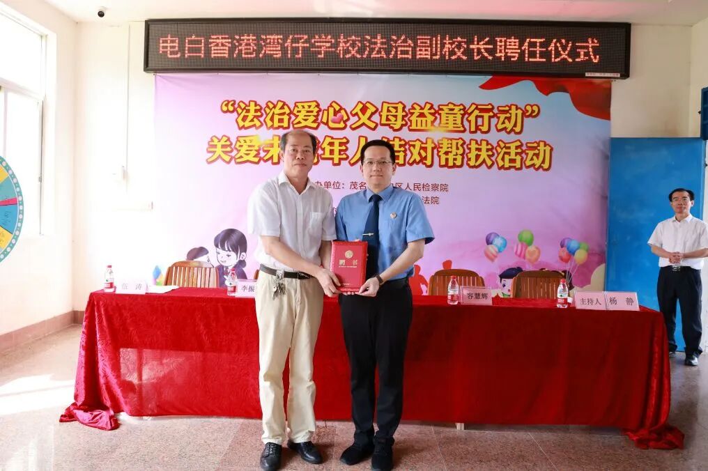 为深入贯彻落实习近平总书记关于未成年人保护工作重要指示批示精神,进一步深化未成年人保护和预防犯罪工作,5月30日,电白区检察院联合区法院到电白香港湾仔学校开展“法治爱心父母益童行动”暨关爱未成年人结对帮扶活动。“法治爱心父母”是区检察院、区法院立足前期调研,结合湾仔学生实际情况,打造的“检察官/法官+助理+学生”结对帮扶模式,旨在通过定制个性化帮扶计划,为湾仔学生提供“精准帮扶”。
