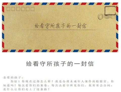 “亲爱的孩子:你好!你现在过得怎么样?我是办理未成年人案件的检察官……无法否认,你做错了事才来到这里,但这只是人生中的插曲,没有人能够用这段经历去评判你们的全部。每次提审,在给予你严厉的教育后,我们更多的是希望你可以真正认识错误,重新回归社会……”