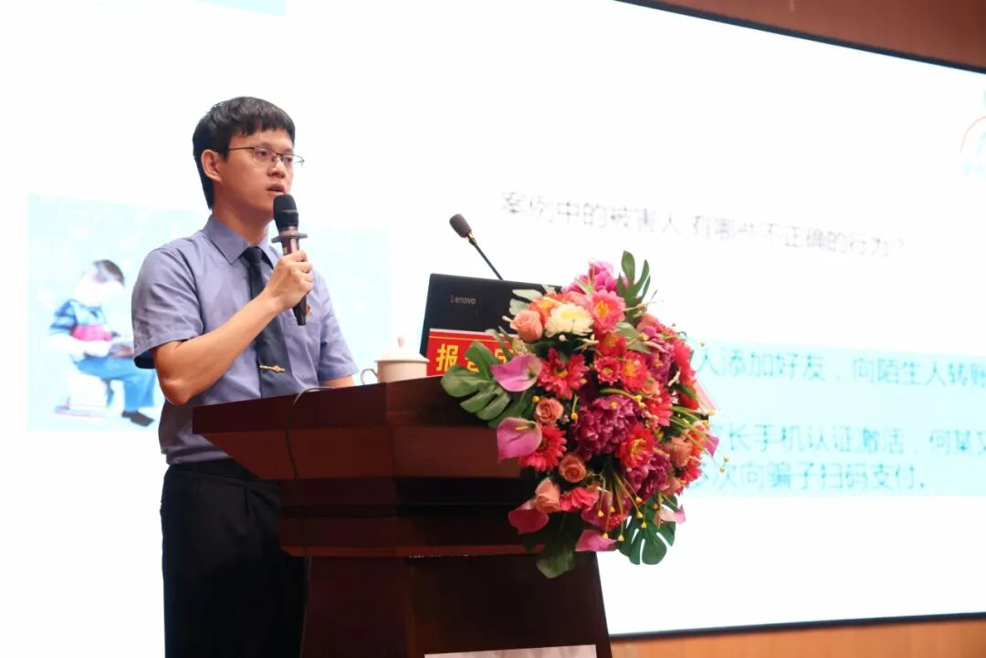 电白区人民检察院第五检察部副主任郑昀为在场近1000名师生带来主题为"青少年反诈小课堂"的授课。课堂上,郑昀副主任针对青少年极易成为诈骗对象的诈骗方式进行阐述,重点讲解了解除游戏“防沉迷”限制类诈骗、扫码刷单类诈骗、领取明星福利类诈骗等六种常见诈骗类型与手法,并以通俗易懂的语言进行以案释法,讲授了各类诈骗的应对方式和防范措施。现场气氛热烈,同学们纷纷表示受益匪浅,将积极向身边亲朋好友宣传反诈知识,共同筑牢反诈“防火墙”。
