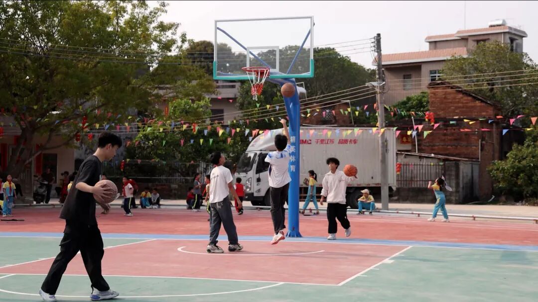 电白区林头镇参桥小学新建成的运动场,崭新的红色跑道环绕四周,标准化篮球场、羽毛球场、跳远沙池等依次排开,红蓝绿相间,焕然一新。孩子们在运动场上欢快地游戏,尽情地奔跑,脸上洋溢着笑容,充满生机与活力,引来附近不少村民驻足观看。