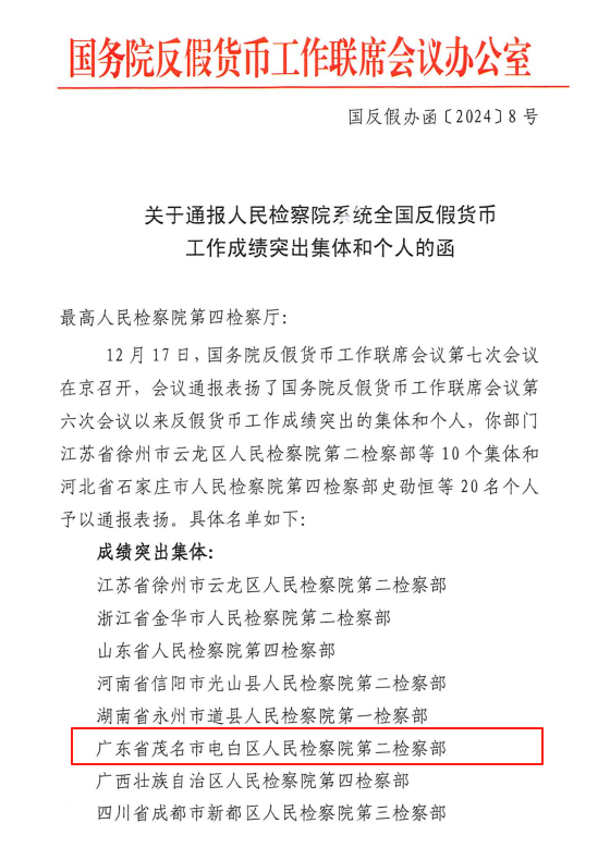 近日,国务院反假货币工作联席会议第七次会议在京召开,会议通报表扬了反假货币工作成绩突出的集体和个人。其中,茂名市电白区人民检察院第二检察部获评“全国反假货币工作成绩突出集体”。
